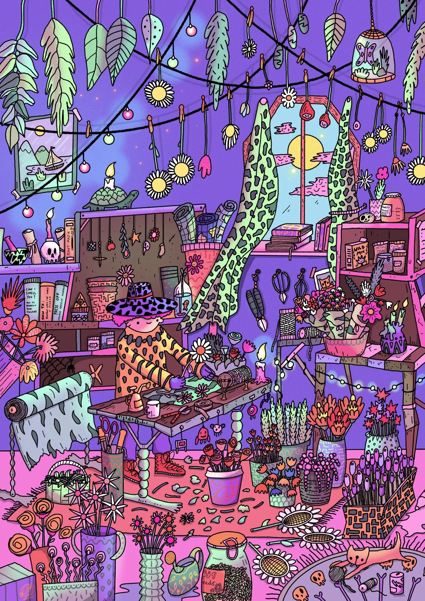 A commission forced him into colour: “My work had been so monochrome and detailed that colour seemed daunting. A musician asked for colourful merch, and that was the push.”