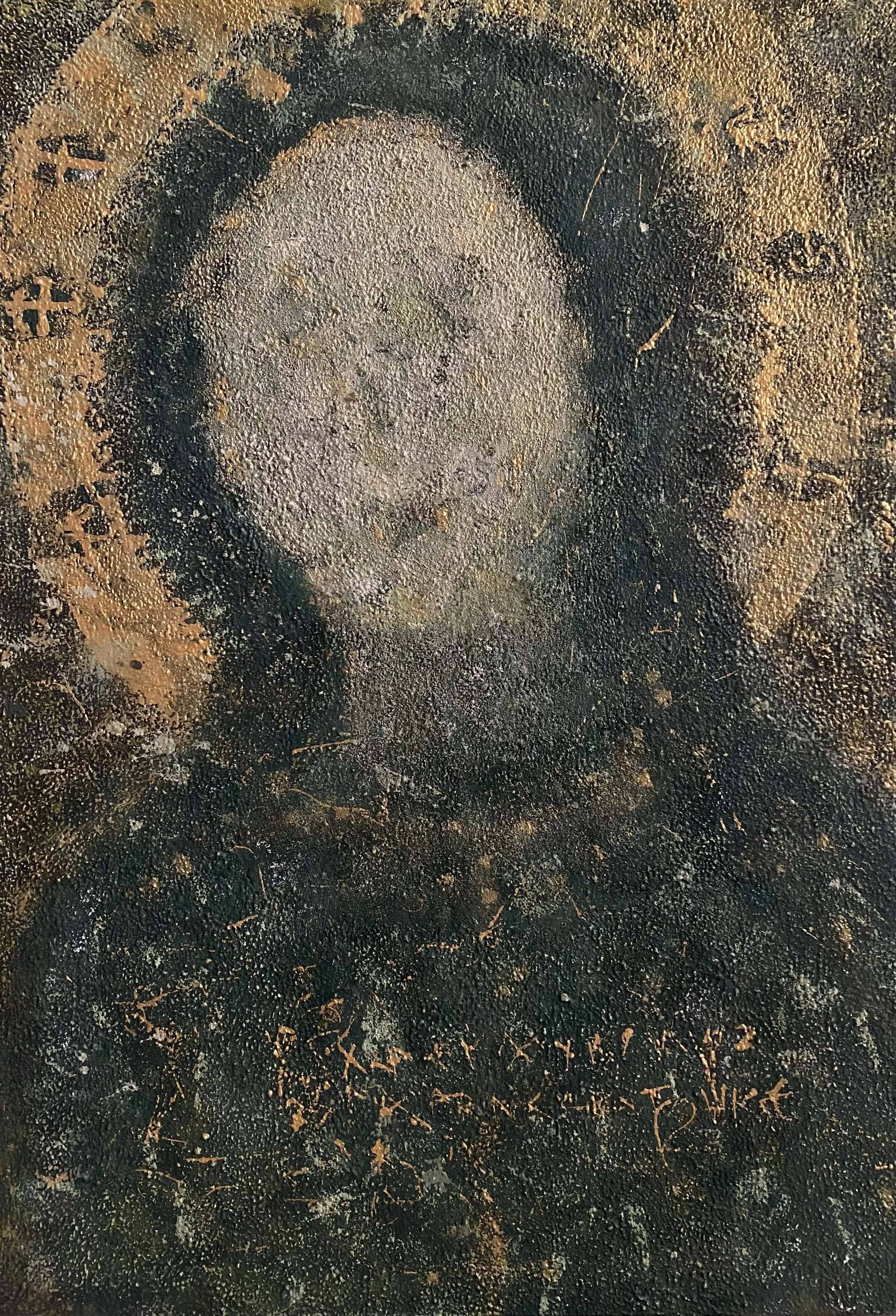 The work deserves better than either. Lamia Eda's paintings on Manifold carry a specific gravity that gets obscured by the label she has applied to them. She describes herself as a self-taught abstract artist, which in this space functions as a shorthand for authentic, unmediated, outside institutional systems. All of that may be true. But the paintings are not abstract in the formal sense, and naming them more precisely would actually serve them better. What she makes is representational work pressed toward its own erasure: figures dissolving into mineral residue, faces at the edge of illegibility, silhouettes that carry the weight of the devotional image or the damaged fresco. This is a lineage, a real and serious one, and the work belongs to it more than it belongs to the catch-all of abstraction. Giving it that address would not diminish it. It would give collectors and critics a more durable way to hold it.