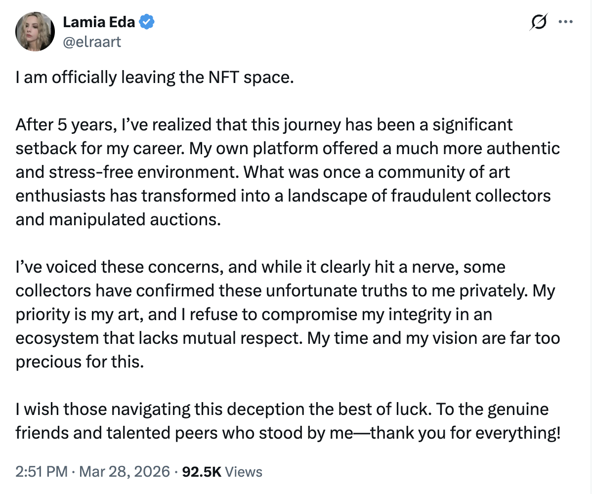 In March 2026, NFT sales hit $138 million. The lowest monthly figure since 2021. Into this climate, an artist named Lamia Eda announced she was leaving the space. The post was honest, frustrated, and recognizable to anyone who has watched talented people exhaust themselves against a market that moves on mood. Within hours, accounts with significant holdings were copy-pasting her departure text as a joke. Within a day, someone bought her work as an apology. She reposted it.